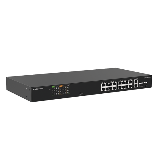 Switch PoE no administrable de 16 puertos 10/100 Mbps con 2 puertos Gigabit, visible en Ruijie Cloud, con un diseño de alta calidad y un presupuesto de PoE de 120 W