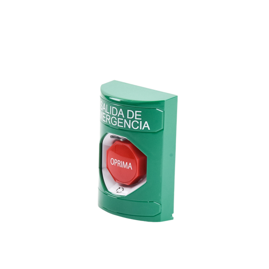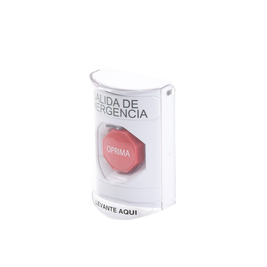 Botón de Salida de Emergencia en Español con Tapa Protectora de Policarbonato Súper Resistente, Acción Mantenida, Girar para Restablecer y Sirena