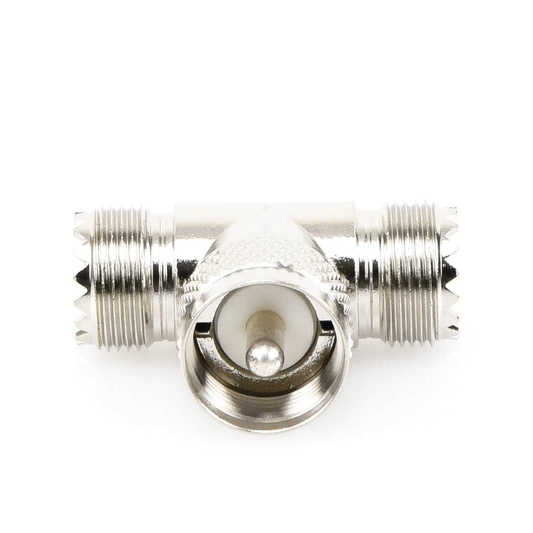 T-shaped adapter, from UHF Male Connector (PL-259) to Double UHF Female (SO-239), Nickel/Silver/Delrin.