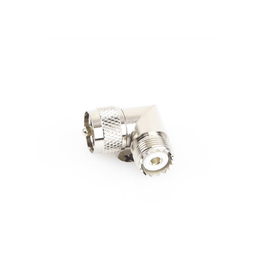 Right Angle Adapter, UHF Male (PL-259) to UHF Female (SO-239) Connector, Nickel/Gold/Delrin.