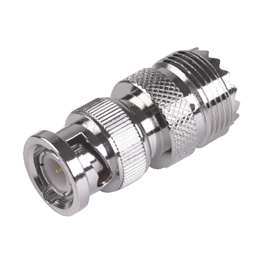 In-line adapter for 50 Ohm, BNC Male-UHF Female (SO-239) connector, Nickel/Gold/Delrin.
