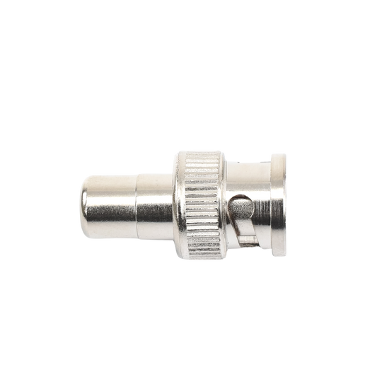 Inline adapter for 75 Ohm, from BNC male connector to RCA female in Audio-Video applications for cameras, monitors and DVRs.