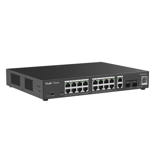 16-port 10/100Mbps unmanaged PoE switch with 2 Gigabit ports, visible on Ruijie Cloud, with a high-quality design and a 120W PoE budget