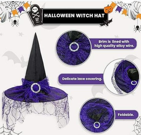 Este sombrero de bruja de Halloween tiene una superposición de malla con textura de telaraña.