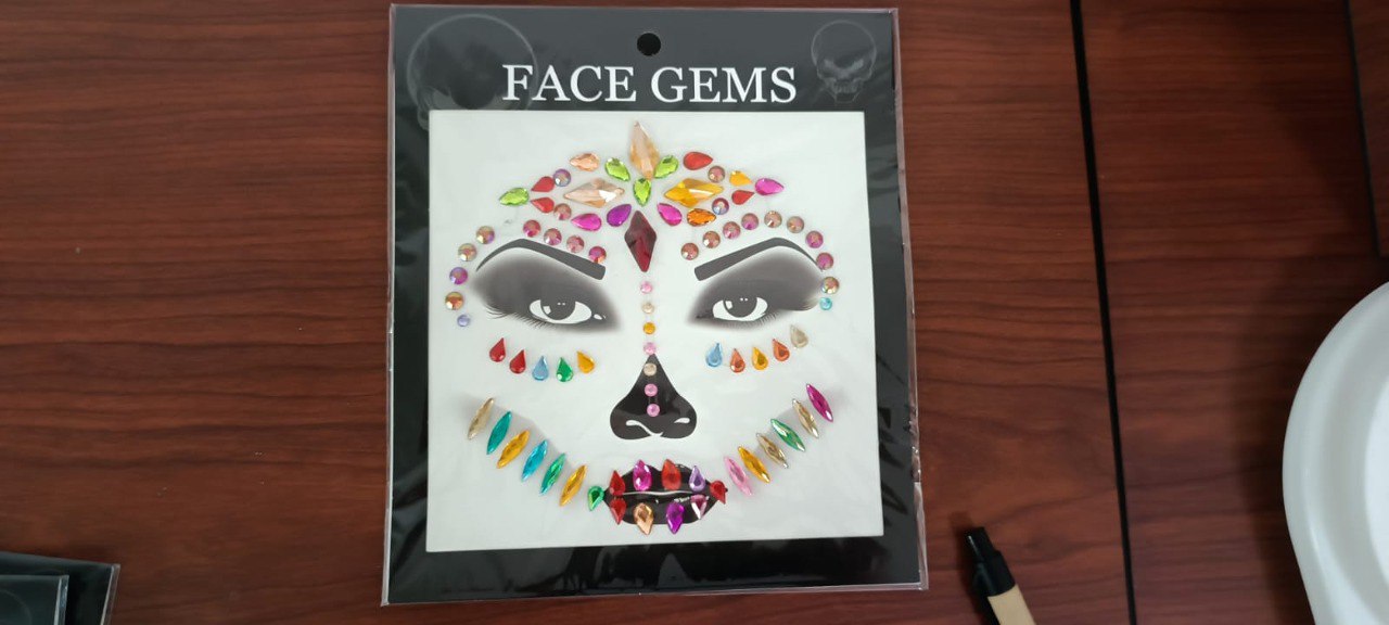 MODO DE USO: 1.Limpia y seca la piel completamente. 2.Recorte el diseño de su elección y retire la película transparente. 3.Coloque las gemas sobre la piel.