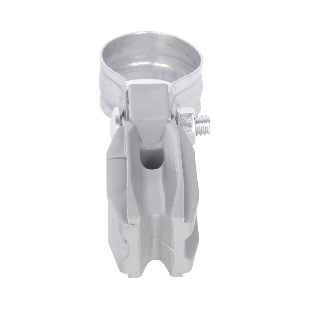 Aislador de paso o esquina con abrazadera de 1' diametro para uso en poste de cerca electrica.